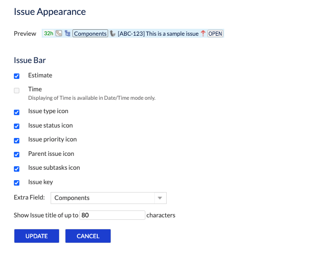 Each issue is represented by an individual bar, that has a set of attributes that describes this task (i.e. priority, issue type, estimate, etc), however, the appearance is customizable and can be adjusted according to users needs in the Configuration->Issues menu: