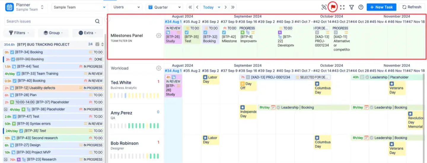 Here’s a basic timeline view, where you can view schedules for a week, month, or quarter, see issue durations, and apply various filters.