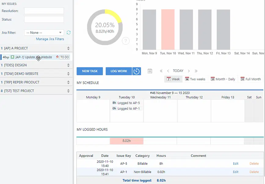 - Personal time tracking - all hours are logged and displayed in personal space for simple and transparent Jira time logging.